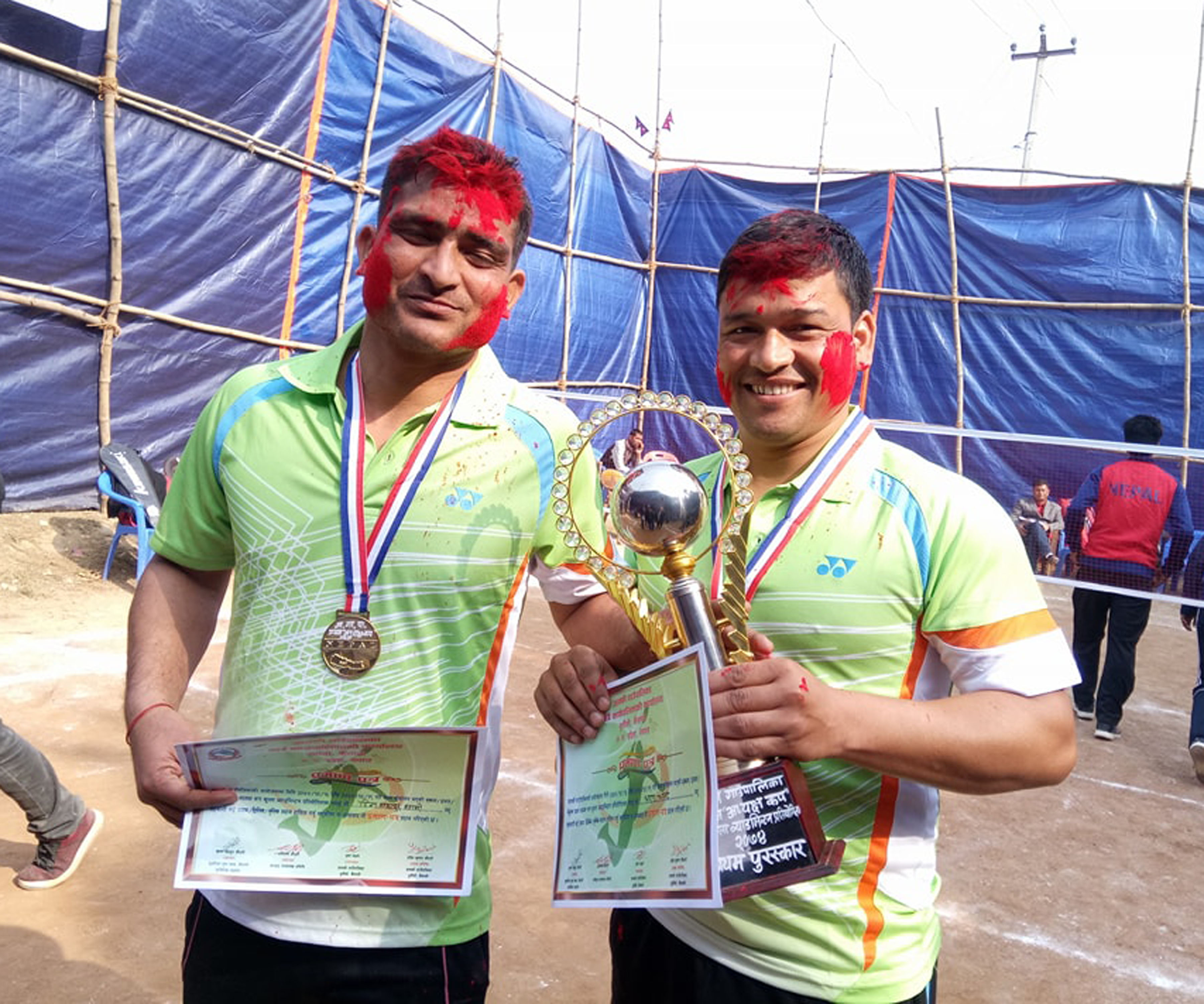 कैलालीको जानकी गाउँपालिकाले दुर्गौलीमा आयोजना गरेको रु ५१ हजार धनराशिको ब्याडमिन्टन प्रतियोगितामा उपाधि विजेता कञ्चनपुरका भरतबहादुर चन्द र दिलबहादुर धामी । तस्वीर : शेरबहादुर सिंह, कञ्चनपुर, रासस