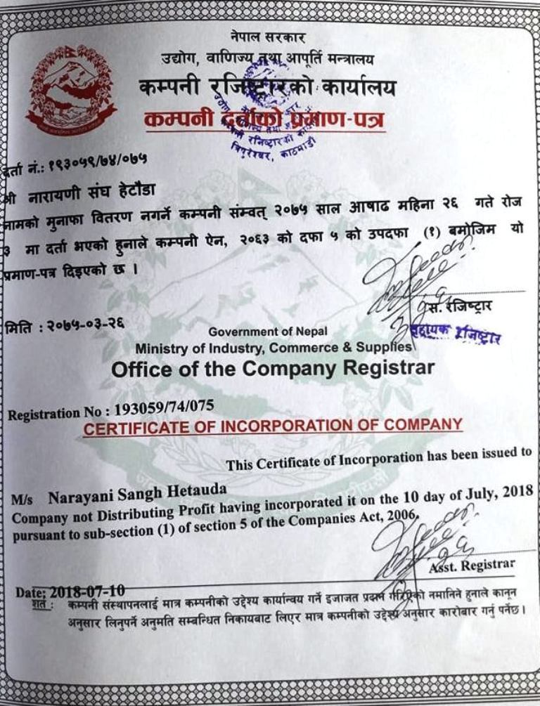 कम्पनी रजिस्टार कार्यालयमा कम्पनी ऐन २०६३ को दफा ५ को उपदफा १ बमोजिम नारायणी संघ हेटौँडा दर्ता गरिएको तत्कालिन नारायणी यातायात व्यवसायी संघका अध्यक्ष हिरालाल श्रेष्ठले जानकारी दिएका छन् । कम्पनी रजिस्टारको कार्यालयमा गत असार २६ गते मंगलबार संघ दर्ता गरिएको र संघको दर्ता नम्बर १९३०५९ रहेको छ । आज संघको कार्यालयमा यातयात ब्यबसायीहरुको भेलामा आयोजित कार्यक्रममा संघमा आवद्ध २६ जनाको कार्य समिति नै सञ्चालक समिति रहने गरी नारायणी संघ दर्ता गरिएको जानकारी दिइएको छ ।
