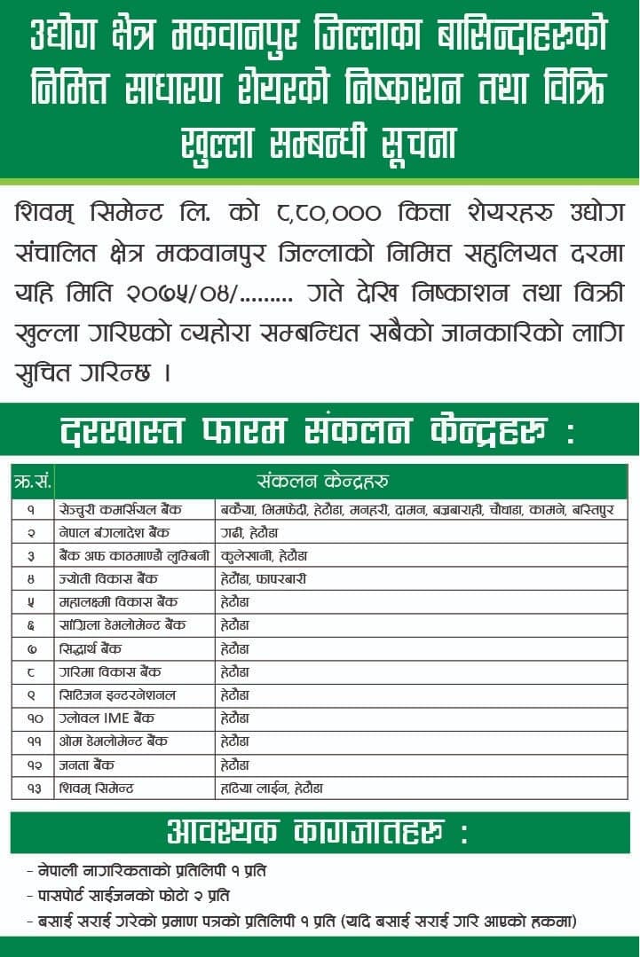 शिवम् सिमेन्टको शेयर खुल्यो, मकवानपुरका यी बैँकहरुबाट आवेदन दिन सकिन्छ