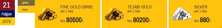 छापावाल सुन बुधबार एकैदिन प्रतितोला २२ सय रुपैयाँले बढेर ८० हजार ५ स रुपैयाँ कायम छ । हिजो (मंगलबार) भने छापावाला सुन ७८ हजार ३ सय रुपैयाँमा कारोबार भएको थियो ।