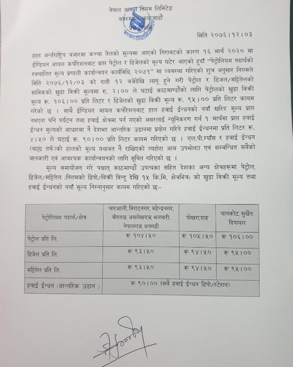 निगमले हवाई इन्धन आन्तरिकतर्फ भने साढे ४ रुपैयाँ घटाएको जनाएको छ । हवाई इन्धनको हकमा प्रणाली छैन। निगम व्यवस्थापनबाटै उक्त मूल्य घटाएको हो। निगमले खाना पकाउने एलपी ग्यास र हवाई इन्धन अन्तर्राष्ट्रियतर्फ भने मूल्य यथावत नै राखेको छ।