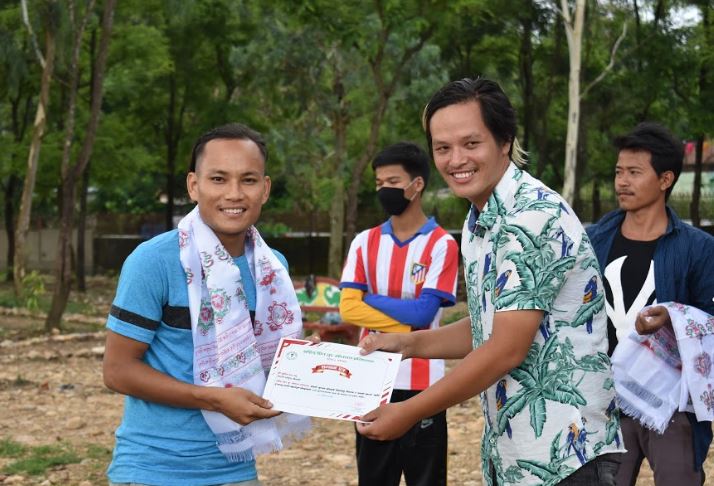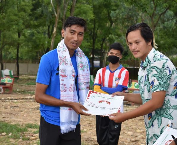 युवा फुटबल खेलाडीलाई खेलकुद सामग्री हस्तान्तरण