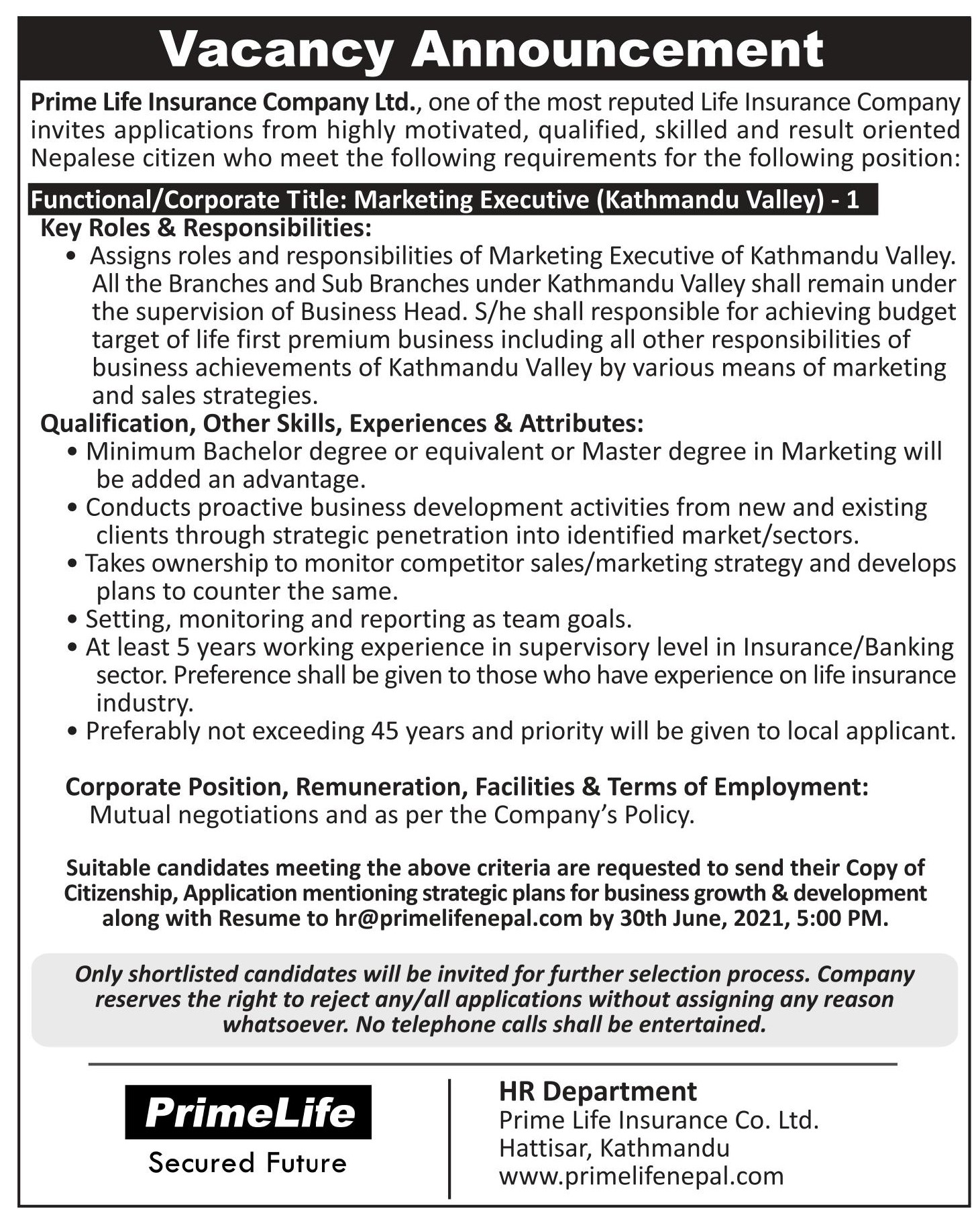 काठमाडौँ । प्राइम लाइफ इन्स्योरेन्स कम्पनी लिमिटेडले कर्मचारी माग गरेको छ। कम्पनीले एक सूचना जारी गर्दैं काठमाडौँ उपत्यकाका लागि मार्केटिङ एक्जुकेटिभ माग गरेको हो ।