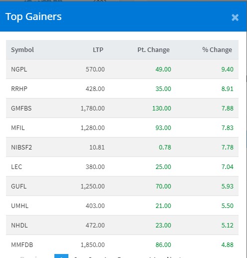 त्यस्तै, रैराङ हाईड्रोपावरको ८ दशमलव ९१ प्रतिशत अकं, गणपति माईक्रोफाइनान्सको ७ दशमलव ८८ प्रतिशत अकं, मन्जुश्री फाइनान्सको ७ दशमलव ८३ प्रतिशत अकं र एनआईबीएल समृद्धि फण्डको ७ दशमलव ७८ प्रतिशत अकंले वृद्धि भएको हो ।