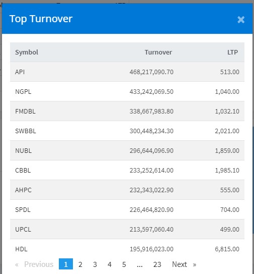 त्यस्तै, ङादी ग्रुप पावरको ४३ करोड ३२ लाख, फस्र्ट माइक्रोफाइनान्स डेभलपमेन्ट बैंकको ३३ करोड ८६ लाख, स्वालम्बन लघुवित्तको ३० करोड ४ लाख र निर्धान उत्थान लघुवित्तको २९ करोड ६६ लाख भन्दा माथिको कारोबार भएको छ ।
