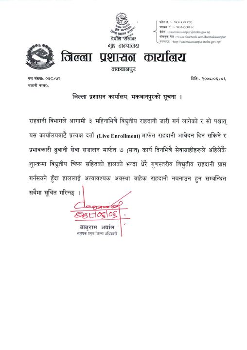 बुधबार मकवानपुरका सहायक प्रमुख जिल्ला अधिकारी अधिकारी बाबुराम अर्यालले सूचना जारी गर्दै जिल्ला प्रशासन कार्यालय मकवानपुरले विद्युतीय राहदानी जारी गर्न सुरु गरेपछि विद्युतीय चिप्ससहितको राहदानी अहिलेको भन्दा गुणस्तरीय हुनुका साथै आवेदन दिएको एक सातामै प्राप्त हुने व्यवस्था मिलाइएको उल्लेख गरेका छन् । हालको भन्दा गुणस्तरीय र छिटो राहदानी प्राप्त गर्न सकिने भएकोले हतार गरेर नबनाउन प्रशासन कार्यालयको आग्रह छ ।