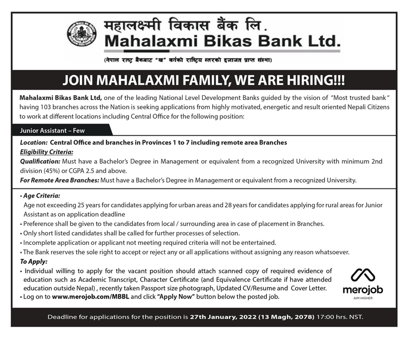 काठमाडौं । महालक्ष्मी विकास बैंक लिमिटेडले कर्मचारी माग गरेको छ । बैंकले केन्द्रीय कार्यालय तथा सात वटै प्रदेश कार्यालयका लागि जुनियर एसिस्टेन्ट पदको कर्मचारी माग गरिएको हो । उक्त पदका लागि बैंकले स्नातक तहमा म्यानेजमेन्ट विषय लिई कम्तिमा २.५ जिपीए प्राप्त कर्मचारी माग गरेको छ ।