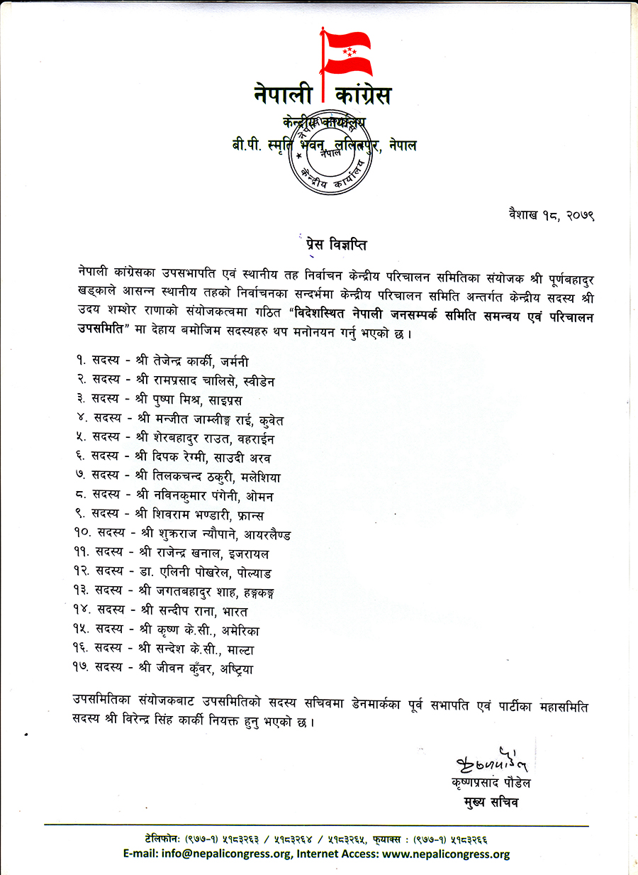 कांग्रेसको नेपाली जनसम्पर्क समिति समन्वय एवम् परिचालन उपसमितिमा सदस्य थप