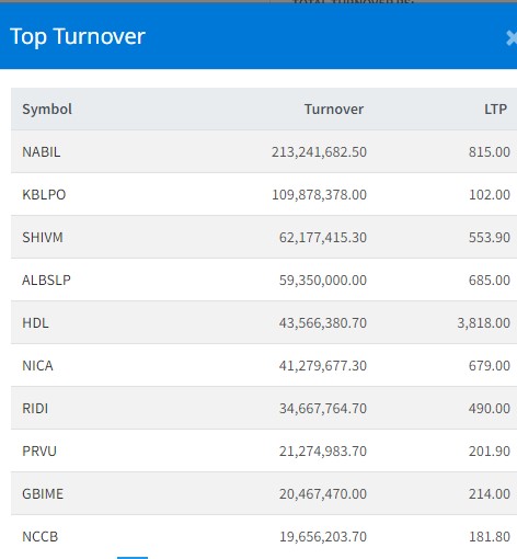 आज सबैभन्दा बढी कारोबार हुने कम्पनीहरुमा क्रमशः नबिल बैंक, कुमारी बैंक, शिवम् सिमेन्ट्स, आशा लघुवित्त र हिमालयन डिष्टिलरीलगयात रहेका छन् ।