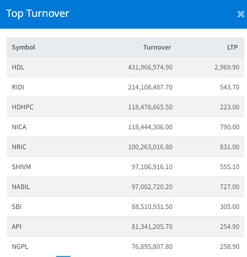 त्यस्तै, रिडी हाइड्रोपावरको २१ करोड ४१ लाख, हिमाल दोलखा हाइड्रोपावरको ११ करोड ८४ लाख, एनआइसी एशिया बैंकको ११ करोड ८४ लाख र नेपाल पुनर्बीमा कम्पनीको १० करोडमाथिको कारोबार भएको छ ।