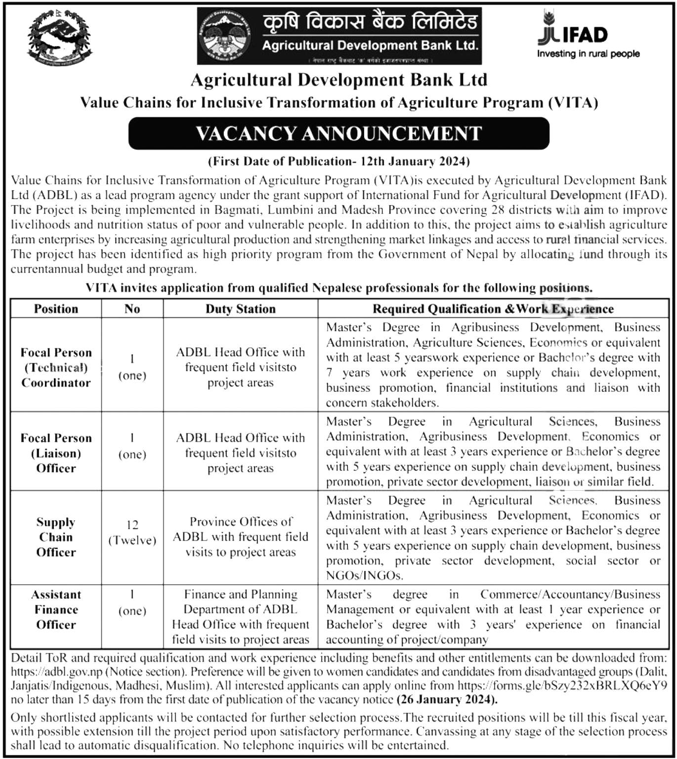 बैंकले फोकल पर्सन कोअर्डिनेटर र अफिसरमा १–१ जना, सप्लाई चेन अफिसरमा १२ जना र असिस्टेन्ट फाइनान्स अफिसरमा १ जना कर्मचारी मागेको हो ।