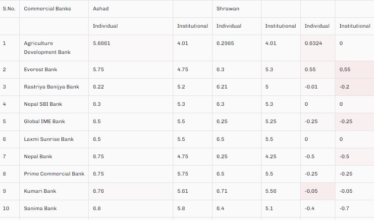 काठमाडौं । वाणिज्य बैंकहरुले नयाँ ब्याजदर सार्वजनिक गरेका छन् । अधिकांश बैकहरुले साउन महिनाका लागि ब्याजदर घटाएका छन् ।