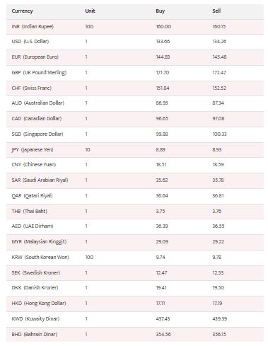 यस्तै, बेलायती पाउन्ड स्टर्लिङ एकको खरिद दर १७१.७० रुपैयाँ रहेको छ भने बिक्री दर १७२.४७ रुपैयाँ रहेको छ । अस्ट्रेलियन डलर एकको खरिद दर ८६.९५ रुपैयाँ रहेको छ भने बिक्री दर ८७.३४ रुपैयाँ रहेको छ ।