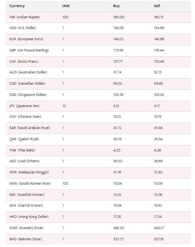 यस्तै, अस्ट्रेलियन डलर एकको खरिददर ९१.७४ रुपैयाँ र बिक्रीदर ९२.१५ रुपैयाँ, क्यानेडियन डलर एकको खरिददर ९९.०२ रुपैयाँ र बिक्रीदर ९९.४६ रुपैयाँ, सिङ्गापुर डलर एकको खरिददर १०३.३६ रुपैयाँ र बिक्रीदर १०३.८२ रुपैयाँ निर्धारण गरिएको छ ।
