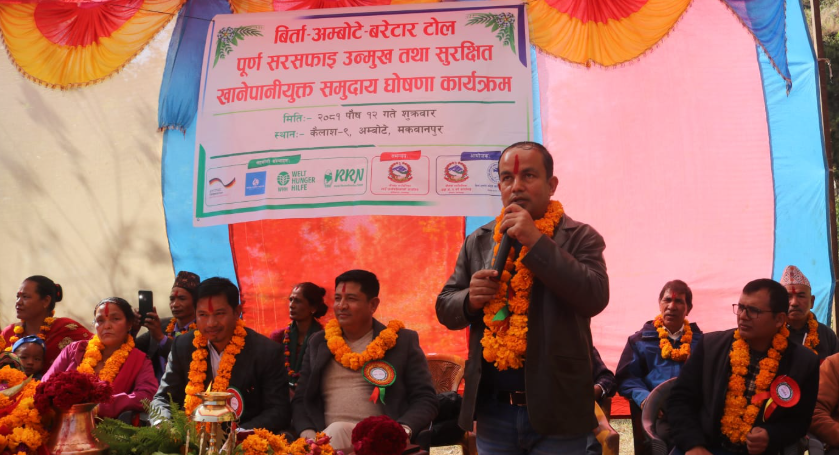 मकवानपुर । खानेपानी तथा सरसफाईका लागि तोकिएको सूचकको पालना गर्दै मकवानपुरको कैलाश गाउँपालिकाका विभिन्न टोलबाट पूर्ण सरसफाई उन्मुख तथा सुरक्षित खानेपानीयुक्त टोलको घोषणा गरिएको छ । शुक्रबार कैलाश गाउँपालिका–९ को बिर्ता, अम्बोटे र बरेटार टोललाई पूर्ण सरसफाई उन्मुख घोषणा गरिएको हो ।