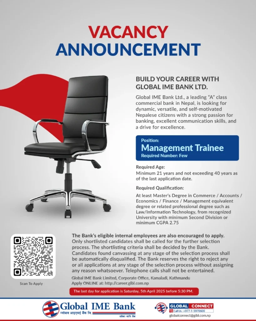 काठमाडौं । ग्लोबल आइएमई बैंक लिमिटेडले कर्मचारी माग गरेको छ । बैंकले एक सूचना प्रकाशित गर्दैै म्यानेजमेन्ट ट्रेनी पदमा केही संख्यामा कर्मचारी माग गरेको हो ।