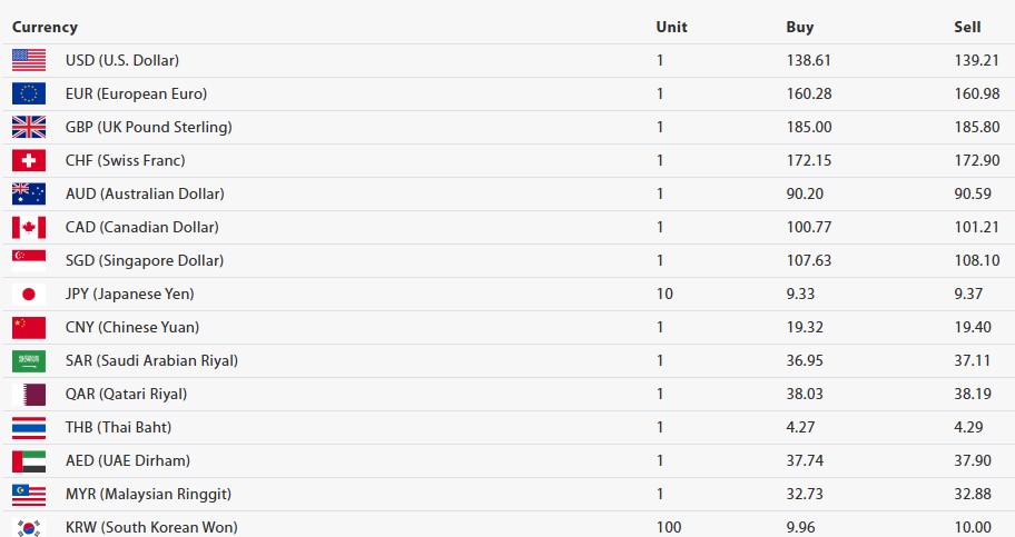 काठमाडौं । नेपाल राष्ट्र बैंकले आजका लागि विदेशी मुद्राको विनिमय दर निर्धारण गरेको छ । राष्ट्र बैंकका अनुसार आजका लागि अमेरिकी डलर एकको खरिददर १३८ रुपैयाँ ६१ पैसा र बिक्रीदर १३९ रुपैयाँ २१ पैसा निर्धारण गरिएको छ ।