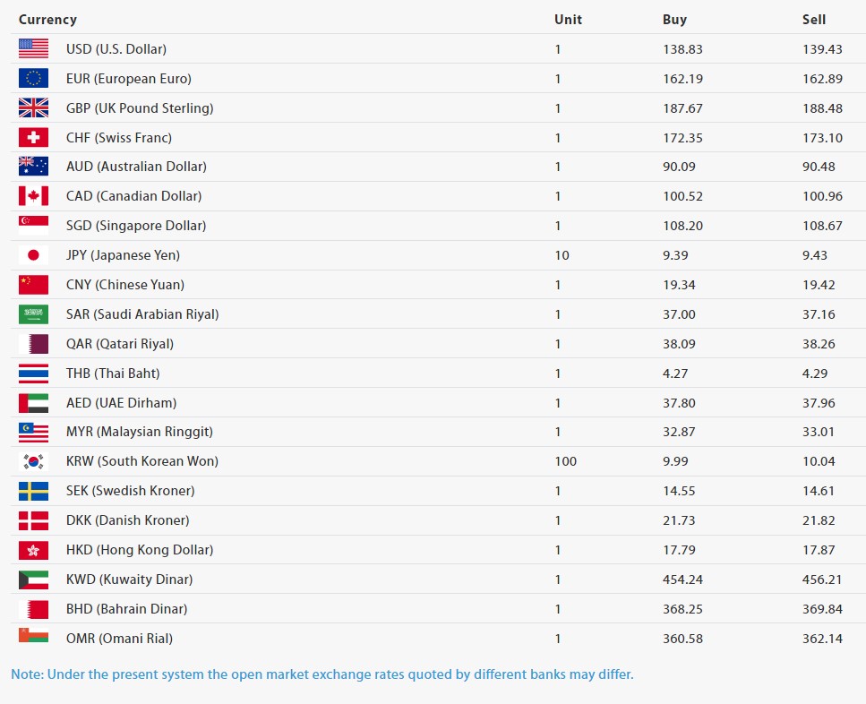त्यसैगरी आज एक कतारी रियालको खरीदमूल्य ३८.०९ रुपैयाँ र बिक्रीमूल्य ३८.२६ रुपैयाँ, एक थाई भाटको खरीदमूल्य ४.२७ र बिक्रीमूल्य ४.२९ रुपैयाँ र एक ओमानी रियालको खरीदमूल्य ३६०.५८ रुपैयाँ र बिक्रीमूल्य ३६२.१४ रुपैयाँ निर्धारण भएको राष्ट्र बैंकले जनाएको छ।