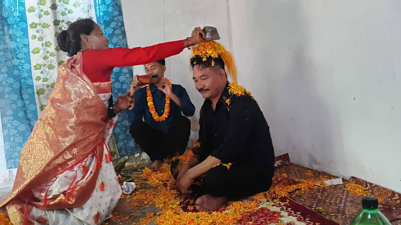तस्बिर : राजनीतिक दलमा आवद्ध भीम पाख्रिन तिहारको टीका लगाउँदै ।