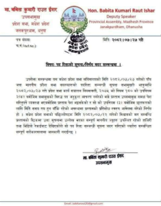 काठमाडौँ ।मधेस प्रदेशसभामा सभामुख रामचन्द्र मण्डल र दलहरूबीचको विवाद उत्कर्षमा पुगेको छ। सभामुख मण्डलले बिहीबार जनता समाजवादी पार्टी (जसपा–नेपाल)का चार र नागरिक उन्मुक्ति पार्टीकी एक सांसदलाई लगातार १० वटा बैठकमा अनुपस्थित रहेको भन्दै पदमुक्त गरेको सूचना जारी गरेका थिए। पदमुक्त गरिएका सांसदहरूमा उर्मिला देवी सिंह, मनिषकुमार सुमन, सञ्जयकुमार यादव, सिंहासन सा कलवार र सारदा शंकरप्रसाद कलवार रहेका थिए। तीमध्ये सिंह नागरिक उन्मुक्ति पार्टीबाट निर्वाचित सांसद हुन् भने अन्य चारजना जसपाका प्रतिनिधि हुन्।