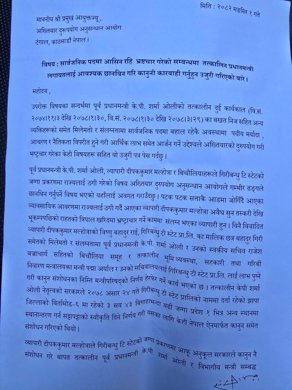 काठमाडौँ । ‘गिरिबन्दु टी–स्टेट’ जग्गा प्रकरणमा पूर्व प्रधानमन्त्री केपी शर्मा ओलीविरुद्ध अख्तियार दुरुपयोग अनुसन्धान आयोगमा उजुरी दर्ता भएको छ।