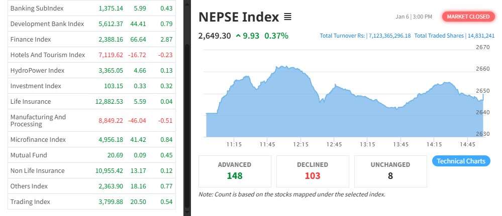 नेपाल स्टक एक्सचेञ्ज (नेप्से) ९.९३ अकंले बढेर २६४९.३० बिन्दुमा कायम भएको छ । आज ३३४ कम्पनीको १ करोड ४८ लाख ३१ हजार २४१ कित्ता शेयर किनबेच हुँदा ७ अर्ब १२ करोड ३३ लाख ६५ हजार रुपैयाँको कारोबार भएको हो ।