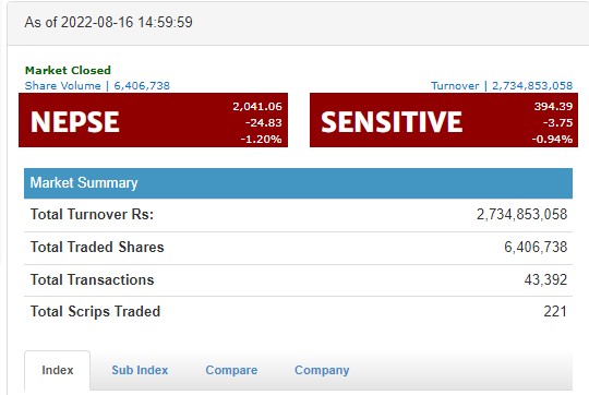 काठमाडौं । आज साताको तेस्रो दिन अर्थात मंगलबार शेयर बजार दोहोरो अंकले घट्न पुगेको छ । सोमबार एकाएक ५५ अंकले बढ्न पुगेको शेयर बजार आज २४ अंकले घटेको हो । आज नेप्से परिसूचक १.२० प्रतिशतले बढेर २०४१ विन्दुमा कायम भएको छ । नेप्सेमा सूचीकृत २२१ कम्पनीको ६४ लाख ६...