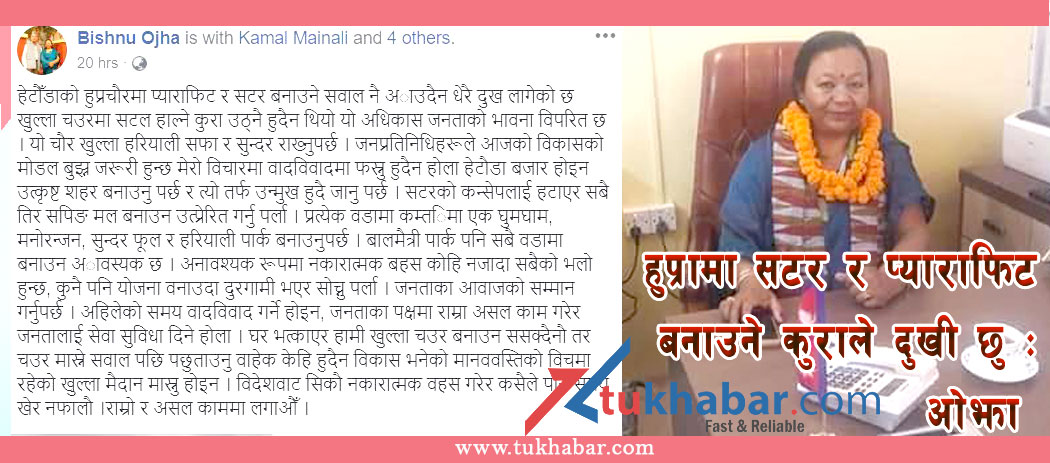 मकवानपुर, २० वैशाख । समावेशी आयोगकी सदस्य बिष्णु ओझाले हेटौंडाको हुप्राचौरमा सटर र प्याराफिट बनाउने कुराले दुखी भएको बताएकी छिन् । समाजिक सञ्जाल फेसबुकमार्फत् उनले बुहचर्चित हुप्रा प्रकरणमा आफ्नो धारणा राखेकी हुन् । ‘खुला चौरमा सटर हाल्ने कुरा उठ्नै हुँदैनथ्यो, यो अधिकांश जनताको भावना विपरित छ, उनले भनेकी छिन्...
