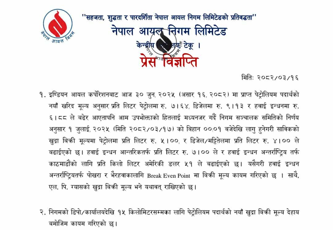 काठमाडौँ । नेपाल आयल निगमले पेट्रोलियम पदार्थमा उच्च मूल्यवृद्धि गरेको छ । नेपाल आयल निगमद्वारा जारी गरिएको विज्ञप्ती अनुसार, पेट्रोलियम पदार्थमा भारी मुल्य वृद्धि भएको हो । मंगलबारबाट लागू हुने गरी पेट्रोलमा ५ रुपैयाँ र डिजेल तथा मट्टितेलमा ४ रुपैयाँ मूल्य बढाइएको निगमले जारी गरेको विज्ञप्तिमा जनाइएको छ ।...