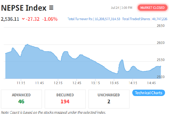 काठमाडौं । आज साता कारोबारको चौथो दिन अर्थात बुधबार शेयर बजार ओरालो लागेको छ । केही दिनदेखि लगातार हरियाली छाएको शेयर बजार आज भने ओरालो लागेको हो । नेपाल स्टक एक्सचेञ्ज (नेप्से) २७ दशमलव ३२ अकंले बढेर २ हजार ५३६ दशमलव ११ बिन्दुमा कायम भएको छ । आज ३११...